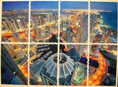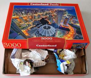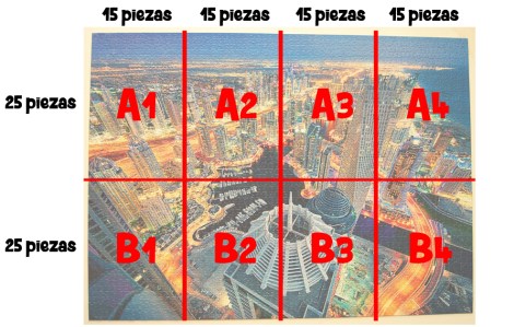 Un puzzle de 3.000 ocupa menos espacio que cualquier marca convencional. En total tiene 60 piezas dispuestas en columna y 50 filas horizontales, por lo que en sentido horizontal (de izquierda a derecha) iremos separando trozos cada 15 piezas y en sentido vertical la división será en dos partes de 25 piezas (contado desde arriba), quedando dividido de la siguiente manera: