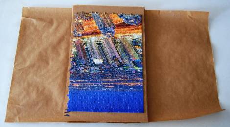 Cada trozo de papel con su plancha de puzzle correspondiente se va apilando sobre las demás teniendo especial cuidado en que, tanto la plancha como el trozo de papel, queden centrados para evitar que se desequilibre el conjunto.