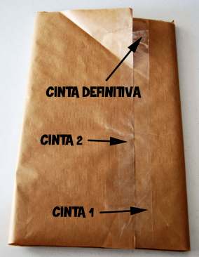 Para poder abrir y cerrar este paquete, sugiero poner una tira adhesiva pegada directamente al papel en cada parte que va a ser unida, para así poner la cinta «removible» sobre estas dos tiras y no romper el papel al ser despegada.