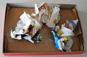 Para finalizar, se pone un trozo de papel arrugado o pelotas de papel para rellenar la distancia que queda entre la tapa de cartón y la caja y así conseguir que quede totalmente encajado para evitar que se mueva.