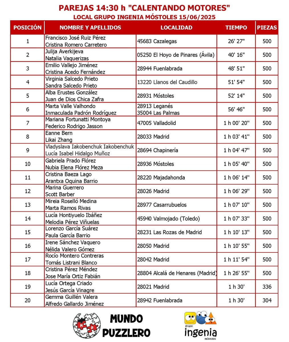 Clasificación Parejas 15-06-25 Calentando motores Publicado 16/06/2025 en 1654 × 1957 en CONCURSO «Calentando motores» (15 de junio de 2025) ← Anterior